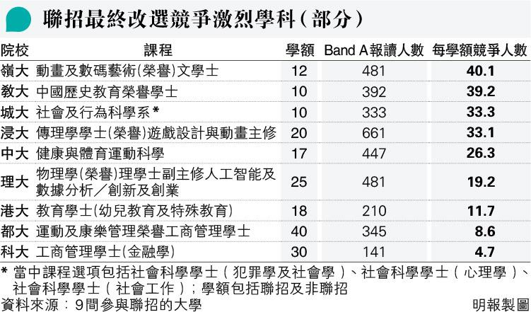8間資助大學及香港都會大學昨公布各自課程在JUPAS的申請數字(見表)。近年智能科技掀起話題,相關學科均受歡迎,其中嶺大「動畫及數碼藝術(榮譽)文學士」課程競爭激烈,有481人放入Band A,該科共12個學額,即平均約40人爭一位。