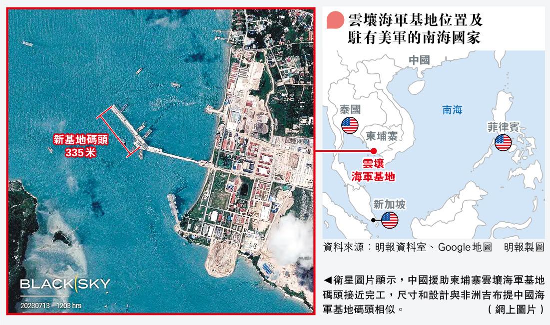 【明報專訊】英國《金融時報》周二根據最新衛星圖片報道,中國援助柬埔寨雲壤海軍基地取得重大進展,基地碼頭接近完工,尺寸和設計與非洲的中國吉布提(Djibouti)海軍基地的碼頭相似,並且足以停泊包括航空母艦在內的各型艦艇。報道引述美國專家指,該項目將為中國提供在南海的戰略優勢。