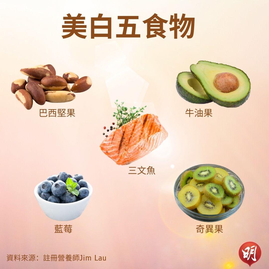 ‧巴西堅果:富含硒,有助減少黑色素的合成和色素沉着;具抗氧化功效,可幫助保護皮膚避免受紫外線照射、延緩黑色素細胞分裂及抑制黑色素生成,從而減少皮膚出現色素沉澱的情況。如對堅果敏感應避免食用。