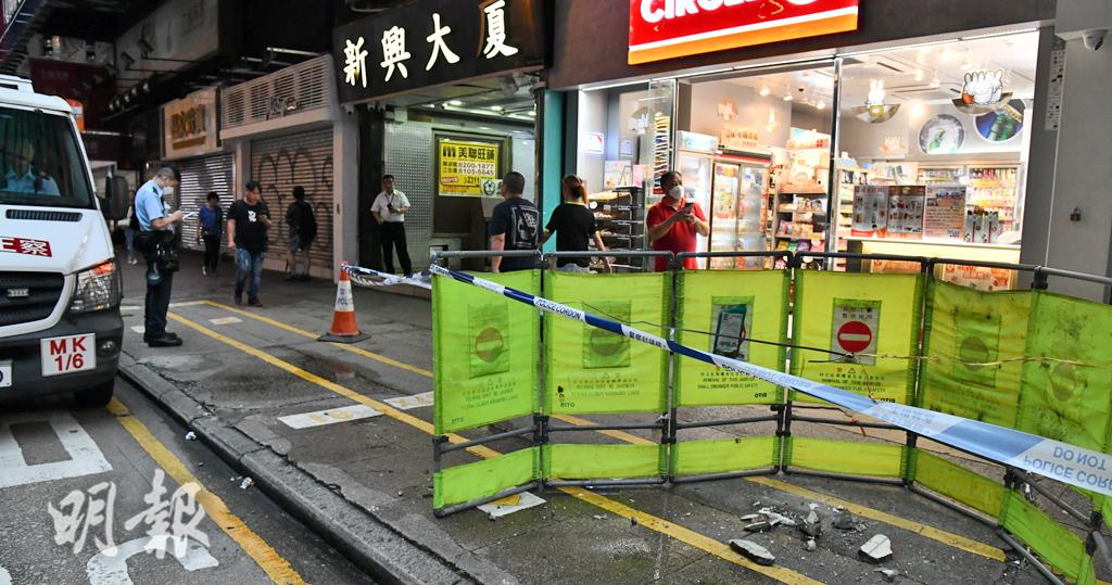 另外,今晨(29日)約8時,旺角彌敦道607號新興大廈亦有石屎塌下,面積約50乘30厘米,跌在大廈對開巴士站。警方到場圍封巴士站位置,正調查事件。