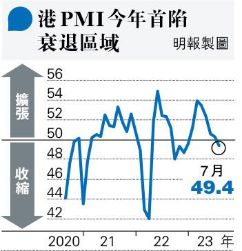 【明報專訊】標普公布,7月份香港採購經理數(PMI)報49.4(見圖),按月下降0.9,為今年首次落入收縮區間,作為前瞻經濟指數,數據反映本港私營經濟今年首次縮減經營活動。標普全球市場財智經濟研究部副總監Jingyi Pan指出,經濟重啟以來推動本港私營企業增長的動力,似乎已在下半年初段耗盡。除整體經營環境轉差,價格壓力再度升溫,很可能進一步抑壓商業信心,影響未來數月市場對服務和商品的需求。