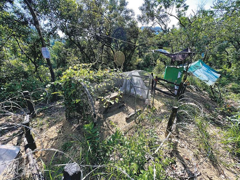 【明報專訊】大圍顯徑邨顯貴樓後山斜坡近日發現架設大型帳幕、鐵籠、圍欄等,部分圍欄帶有防爬刺,引起網民憂慮非法佔用官地及傷害野生動物。地政總署前日已張貼告示,要求停止佔用土地,漁護署在場檢獲4個捕獸器。長春社公共事務經理吳希文形容設施規模「誇張」,但認為漁護署舉證有人狩獵或有困難,只能藉佔用土地相關法例清場。