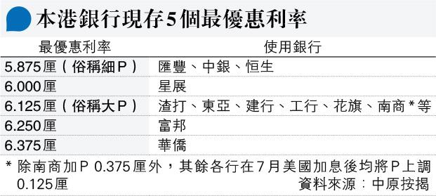 【明報專訊】上月底美國加息0.25厘,帶動本港銀行今輪最優惠利率上調已大致完成,大部分銀行跟隨龍頭匯豐加息0.125厘,惟南洋商業是次加達0.375厘。加息塵埃落定,本港銀行市場再出現5個最優惠利率(見圖),由大行「細P」最低5.875厘,到華僑的6.375厘,相差最多半厘。