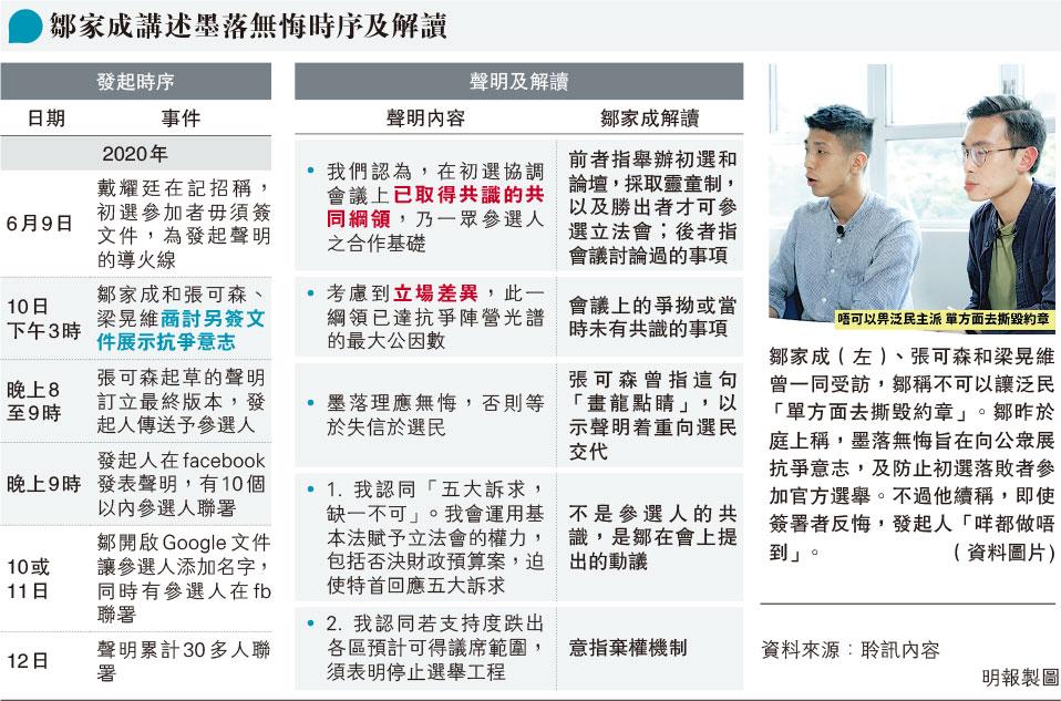 不認罪被告鄒家成與認罪被告張可森、梁晃維,2020年6月10日發布「墨落無悔」聲明,稱各人會運用基本法賦予立法會的權力,包括否決財案,逼特首回應「五大訴求」,成為聆訊關鍵。鄒家成在庭上表示,他從初選協調會議知悉各人共識會變成一份文件,惟戴耀廷6月9日記者會宣布不必簽署公開協議,認為看來是退縮的舉動,「我就覺得有無咁兒戲?」