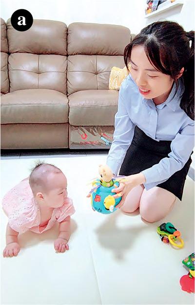 .利用有視覺效果或音樂的玩具,吸引嬰兒把頭部轉向患側(圖a);約滿3個月大的嬰兒,也可多鼓勵tummy time和坐着玩耍