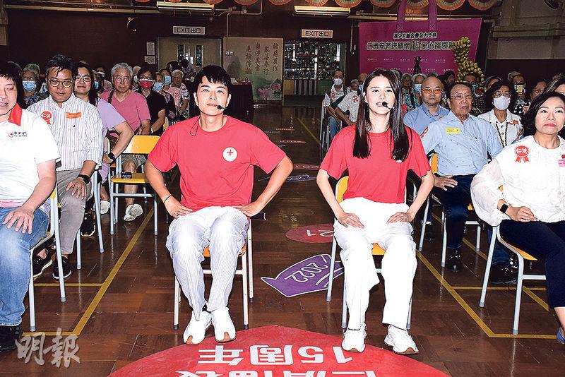 【明報專訊】蕭正楠與黃翠如昨日夫妻檔到葵涌出席「仁濟安老送關懷.愛心福袋賀回歸」活動,派福袋及教長者做運動。蕭正楠表示最想老婆做運動,翠如指他們有一起跑步,只是跑得比老公慢。談到與長者相處,蕭正楠大讚老婆叻,「翠如跟奶奶相處十分融洽,只要叫一聲『奶奶』,我媽咪就軟晒,不需她下廚」。翠如笑說:「奶奶話聰明人不需要學太多,這方面我最受教。」