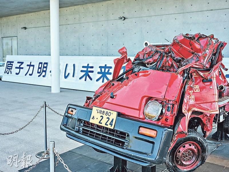 數年前開幕的「東日本大地震與核能災害傳承館」,出口處擺放一幅大型橫額,寫道「核能是帶來光明未來的能源」,旁有一輛當年因海嘯損毁的消防車殘骸。根據傳承館資料,標語由當地一名小六生創作,於1987年市政府比賽脫穎而出,1988和1991年先後置於雙葉市車站及市政廳前;至2016年塌下,當地才拆卸及仿製相關標語的橫額,放在傳承館。記者在該館出口處遇上適逢假期到訪的栗原先生,他直言標語相當諷刺。