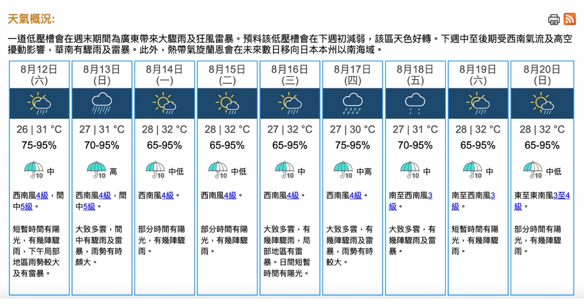 即時熱點 天氣|天文台:短暫時間有陽光 下午局部地區雨勢較大 (10:45) 發佈於 2 年 前 2023 年 8 月 12 日 By 明報 上午10時30分,天文台錄得29.1°C,相對濕度75%。一道低壓槽正為南海北部及廣東沿岸帶來驟雨。天文台預測本港地區今日(12日)短暫時間有陽光,有幾陣驟雨,下午局部地區雨勢較大及有雷暴,最高氣溫約31°C。吹和緩西南風,風勢間中清勁。展望明日(13日)間中有大驟雨及雷暴。隨後一兩日天色較為明朗,亦有幾陣驟雨。(天文台) 相關文章:天氣速遞編輯推介 Up Next 圖看「亞洲最高樹」 樹齡1450、高101.2米【附巨樹全圖】 (16:00) 不要錯過 英仙座流星雨8月13日凌晨高峰期 今晚或明晚10時後觀測最佳【附太空館直播連結】 (11:03) 繼續閱讀 贊助商 猜你喜歡 天氣|天文台:周一市區16°C-20°C 多雲乾燥 相對濕度料低至45% (19:08) 天氣|天文台:今日大致多雲非常乾燥 市區氣溫料16°C-20°C (09:40) 天文台:冷鋒稍後橫過廣東沿岸 周日早上市區最低14°C (12:22) 天氣|天文台:多雲有陣雨 午夜氣溫低至16°C (10:07) 天氣|天文台:周六多雲有雨 日間最高22℃ 午夜跌至16℃ (21:48) 天氣|天文台:天晴乾燥最高24°C 明日氣溫顯著下降 (08:43)
