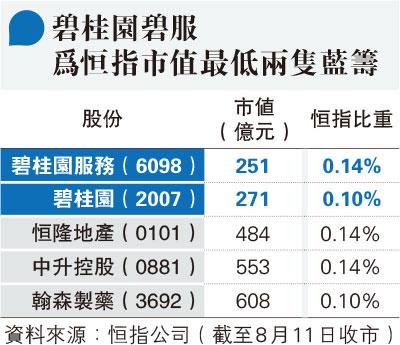 【明報專訊】作為藍籌孖寶的碧桂園(2007)及碧桂園服務(6098)曾經被視為「一門雙傑」,不過隨着內房債務危機爆破,碧桂園上周內插水近三成,淪為罕見的藍籌毫子股。而截至上周五,碧桂園及碧桂園服務佔恒指比重已在藍籌最低之列,比重各僅佔0.1%及0.14%,市值亦在藍籌中包尾(見表),令在本周五(8月18日)恒指季檢被剔出的風險急增,股價或進一步走弱。
