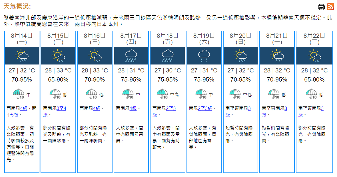 【18:45更新】一道低壓槽正為南海北部及廣東沿岸帶來驟雨及雷暴。本港地區今晚(13日)及明日(14日)天氣預測:大致多雲,有幾陣驟雨,明日初時驟雨較多及有雷暴,日間短暫時間有陽光。氣溫介乎27°C至32°C。吹和緩西南風,明日風勢間中清勁。展望隨後一兩日部分時間有陽光及酷熱。本周後期天氣漸轉不穩定。根據天文台九日天氣預報,一連九日有驟雨。