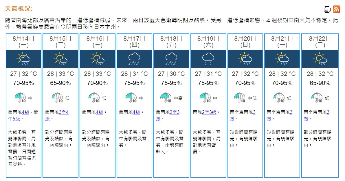 即時熱點 天文台:與低壓槽相關驟雨及狂風雷暴 或未來一兩小時影響本港 (13:58) 發佈於 2 年 前 2023 年 8 月 14 日 By 明報 【13:58】天文台表示,與低壓槽相關的驟雨及狂風雷暴可能在未來一兩小時影響本港。 【08:35】上午8時20分,天文台錄得29.5°C,相對濕度84%。一道低壓槽正為南海北部及廣東沿岸帶來驟雨及雷暴。天文台預測本港地區今日(14日)大致多雲,有幾陣驟雨,局部地區有狂風雷暴。日間短暫時間有陽光及炎熱,最高氣溫約32°C。吹和緩西南風,風勢間中清勁。展望未來一兩日部分時間有陽光及酷熱。本周後期天氣漸轉不穩定。 (天文台) 相關文章:天文台天氣速遞編輯推介 Up Next 高鐵「靈活行」推出 一文睇西九龍往返福田改票資訊【附12306手機App改票教學】 (13:10) 不要錯過 短片:夏威夷山火居民守望相助 咖啡店變成教堂舉行彌撒 (14:12) 繼續閱讀 贊助商 猜你喜歡 天氣|天文台:日間乾燥最高19°C 明日風勢較大 (09:41) 天氣|天文台:周五多雲寒冷 市區最低11℃ (22:07) 天氣|天文台:多雲寒冷 日間氣溫徘徊14°C (08:18) 天氣|天文台:周四多雲早晚寒冷 早上市區最低11°C (20:59) 天氣|天文台:日間部分時間天色明朗及乾燥 氣溫徘徊16°C (08:25) 天氣|周一市區19°C-23°C 周二晚上轉冷 周三氣溫跌至12°C (20:03)