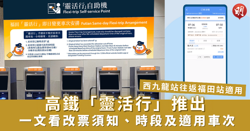 港鐵即日(14日)起新增「靈活行」,在原有的高鐵「一般改票」服務以外,允許往來高鐵西九龍站至福田站的乘客在乘車當天的指定時段內臨時「改票」,乘客不論早到或遲到,都可即日改乘當天其他指定班次,手續費全免。本文整合「靈活行」重點及使用教學。