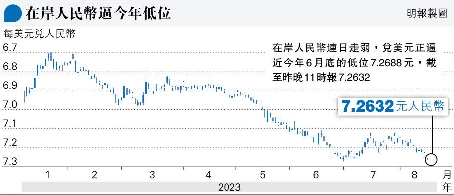 人民幣亦一同走弱,昨日人民銀行設定人民幣中間價報7.1686,較市場計算偏強668點子,幅度為自上月20日以來最多,惟未能阻止人民幣續跌。除了內房和貸款數據,美國7月生產者物價指數(PPI)重新升溫增加今年內再加息預期,美匯指數昨晚重上103,帶動離岸人民幣昨晚曾跌至7.2927,失守6月底的今年低位,見去年11月以來新低,截至晚上11時報7.2818,下跌217點子(1元等於1萬點子),在岸價報7.2632,下跌237點子。