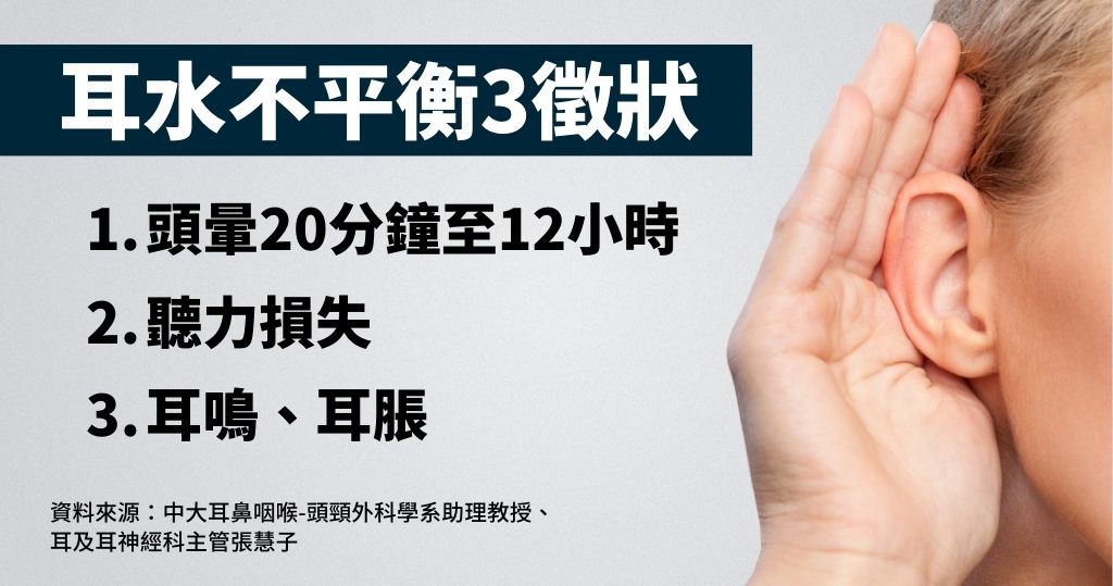 張慧子解釋,所謂耳水不平衡是指內耳的內淋巴液(即是耳水)脹大,與外淋巴液不平衡。而低鹽飲食可避免水腫,減少病發風險。「梅尼爾氏症」病發原因包括遺傳和感染,亦可能原因不明。倘出現急性失聰可處方類固醇治療;有嚴重耳壓和頭暈可做小型手術,將一支管放入耳膜,幫助減低耳壓,紓緩頭暈;醫生亦可能處方藥物減少神經線反應。