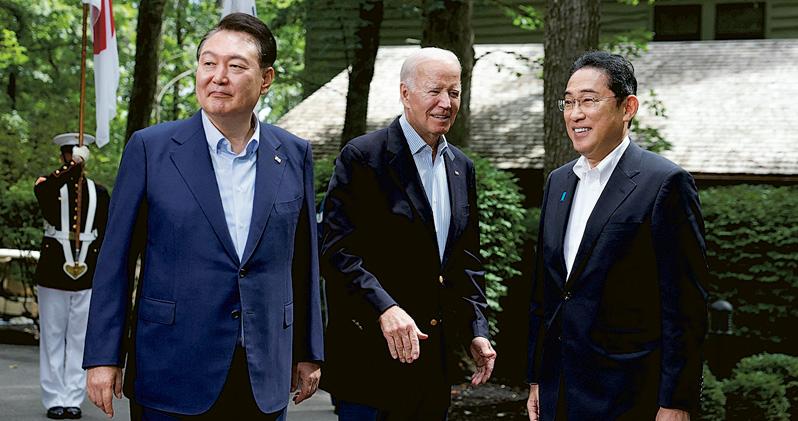 【明報專訊】美國總統拜登、日本首相岸田文雄及韓國總統尹錫悅周五(18日)在美國大衛營舉行首次正式3邊峰會,就如何應對印太地區及其他地區的緊張局勢制定策略。韓聯社報道,3國領袖繼之前提到的《大衛營原則》和《大衛營精神》文件外,還會在峰會上達成三邊協商約定,許下危機時刻相互協商的承諾,作為應對共同威脅的協作方案。白宮官員在峰會開始前亦確認,3國將公布「協商約定」共同應對可能出現的危機。路透社的報道稱,美國正謀求與兩國合力應對中國愈來愈強的影響力。