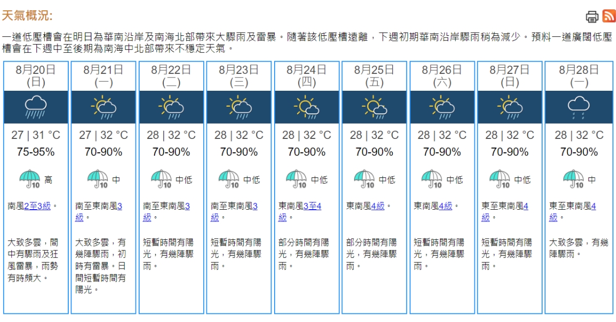 【19:00更新】一道低壓槽正為廣東沿岸及南海北部帶來驟雨及雷暴。天文台預測本港地區今晚(19日)及明日(20日)大致多雲,有幾陣驟雨。明日驟雨較多及有狂風雷暴,雨勢有時頗大。氣溫介乎27至31℃。吹輕微至和緩偏南風。展望隨後兩三日仍有幾陣驟雨,短暫時間有陽光。(天文台)