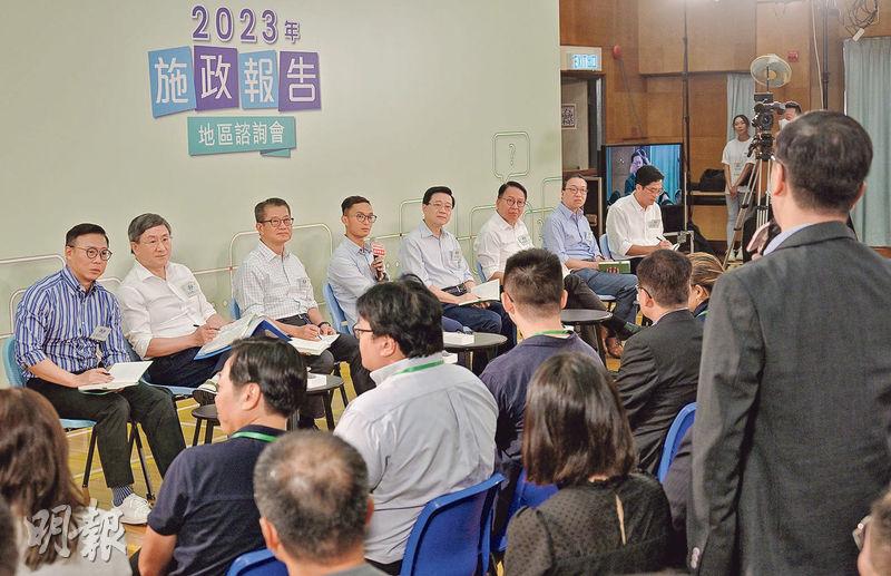 今年首場《施政報告》地區諮詢會昨早於筲箕灣愛秩序灣官立小學舉行,李家超率領政務司長陳國基、財政司長陳茂波、律政司長林定國等10多名司局長出席。李家超表示,上任後第二份《施政報告》旨在鞏固及落實去年《施政報告》的政策和指標,為各項政策訂立優次,並會探討在哪些新領域需「做深做廣」。