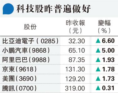 科技股昨日普遍做好,重磅股阿里巴巴(9988)和美團(3690)分別上升1.93%和1.73%(見表),合共推動恒指上升50點,摩根士丹利發表報告唱好比亞迪電子(0285),指其受惠電動車和智能產品增長,上半年業績理想,納入首選股份,昨日上升6.6%。