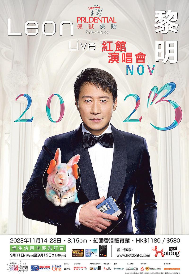 【明報專訊】黎明(Leon)日前透露11月舉行紅館演唱會,只說頭場日期是11月14日,還問歌迷:「頭場1114,你話係咪好任性先?」昨日正式公布演唱會詳情,《Leon黎明紅館演唱會2023》將於11月14至23日舉行10場,票價分別為1180元及580元,9月11日至9月15日指定信用卡優先訂票。
