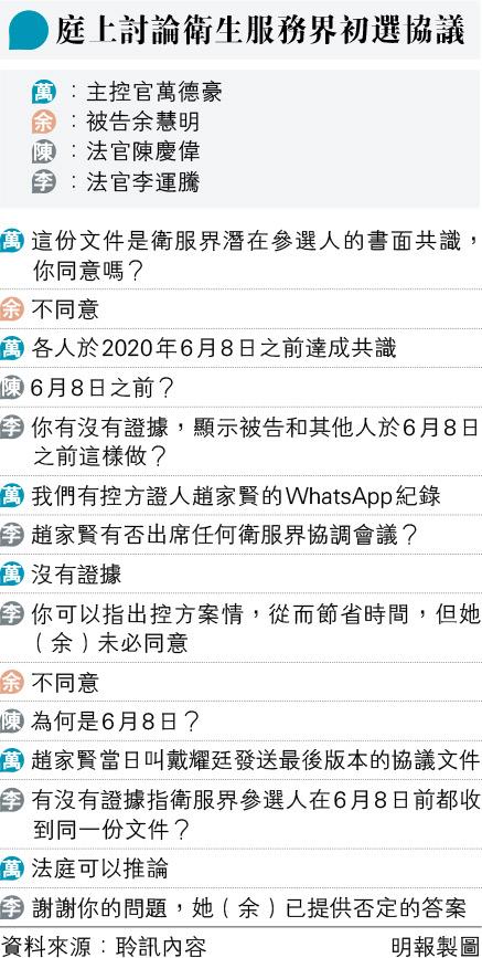 此外,衛服界信息群組對話顯示,4名參選人曾爭議選民認證安排,余慧明作供稱冀該界別初選具約束力,目的是揀選一人出選立會;余無奈接受戴耀廷最終採用無約束力的方案。余重申衛服界從沒討論預算案,戴於投票日後才首次在群組稱「不提否決每一個議案」,余估計因應建制派和「黨媒」指初選違法,戴的信息純屬資訊分享。戴其後又稱衛服界毋須開會,不久退出群組。