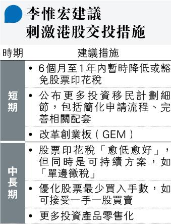 【明報專訊】環球經濟不穩定,市場氣氛低迷,立法會議員金融服務界李惟宏認為,港府應從短、中及長期考慮增加本港市場吸引力和競爭力。短期方面,他建議未來6個月至1年暫時豁免或減少股票印花稅,以刺激交投量。他說:「未必即刻解決所有問題,令交投增加幾十倍,但最主要是該措施可即時實行且短期內可激活市場」。