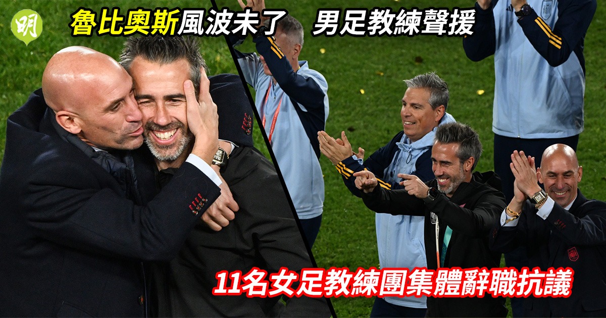 西班牙足總主席魯比奧斯,在女足世界盃頒獎儀式中親吻球員珍妮花靴莫素一事餘波未了。靴莫素除得到81名女足運動員聯署支持外,據英國廣播公司(BBC)報道,西班牙女足國家隊的的大部分助教昨已請辭,以示對親吻事件男主角魯比奧斯的抗議,但當中不包括女足教練佐治韋達。
