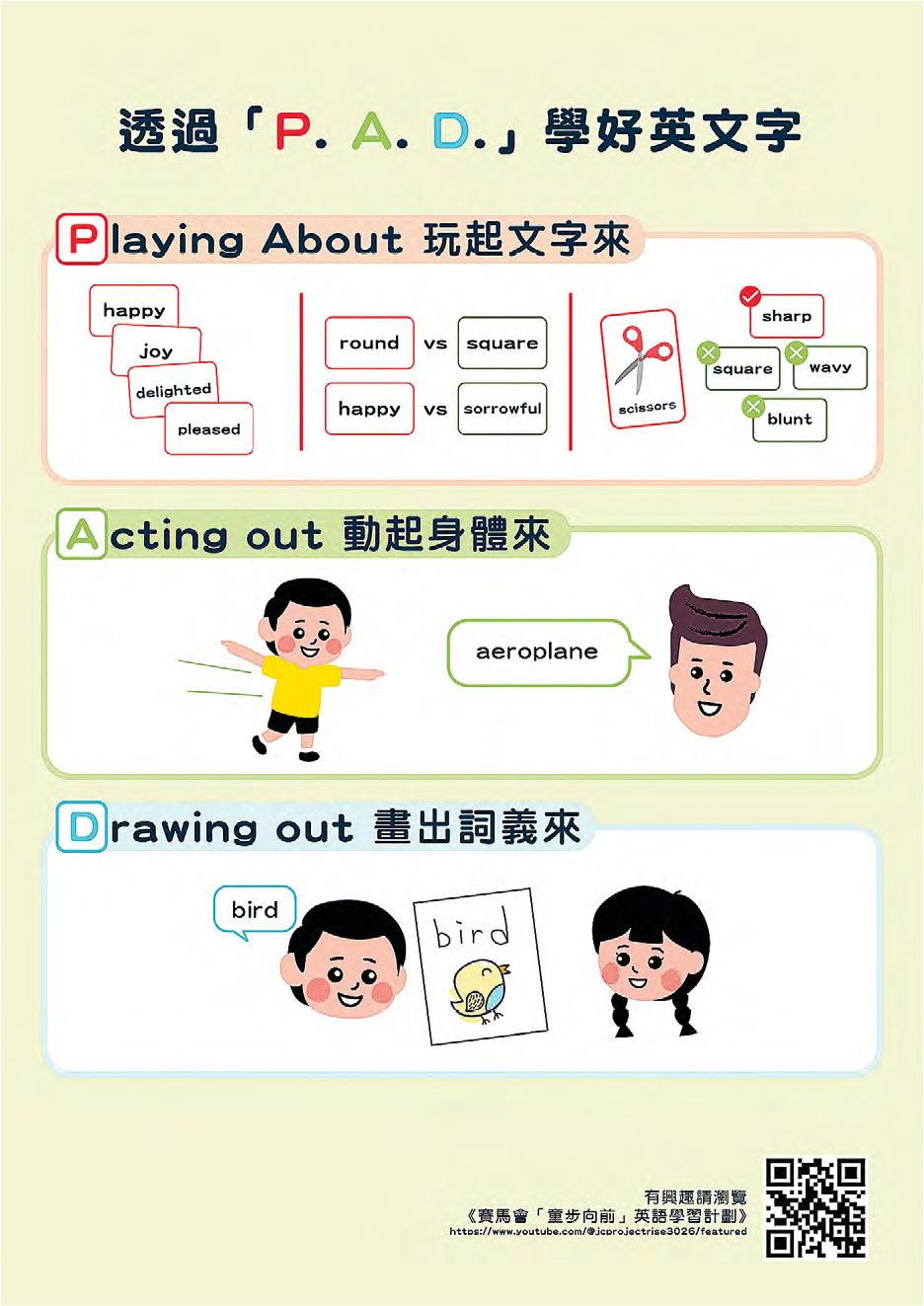 【明報專訊】之前透過一系列的文章,向讀者介紹了語音意識、組詞知識和語素意識等認知學習元素。除此之外,要學好英語,充足的詞語庫(vocabulary bank)對孩子的整體英語理解及應用相當重要。研究指出,家長可以透過P. A. D.(即playing玩起來、acting 動起來、drawing畫出來),鞏固孩子所學詞語。