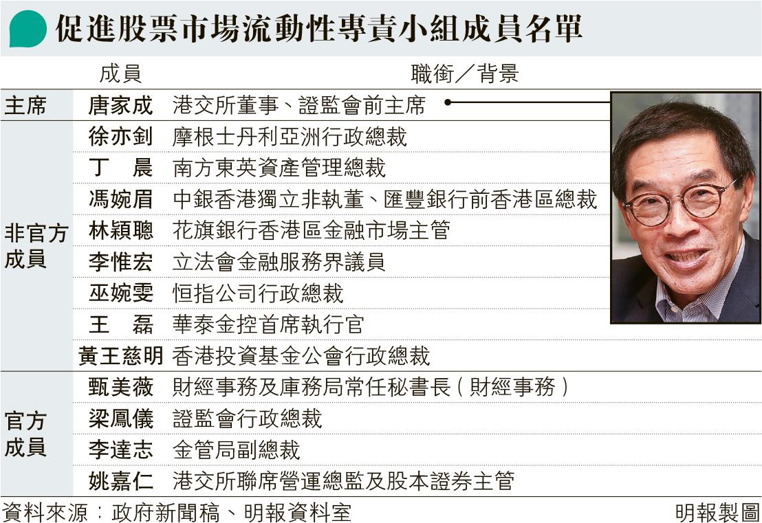 【明報專訊】特首李家超周日預告,財政司長陳茂波會成立專責小組研究促進股票市場流通量。政府昨宣布成立「促進股票市場流動性專責小組」,全面檢視影響股市流動的因素,並向特首提交改善建議。證監會前主席、現任港交所(0388)董事的唐家成擔任專責小組主席,其他成員包括8名金融業界人士、財金官員,以及證監會、金管局和港交所高層代表。專責小組將於短期內開會。
