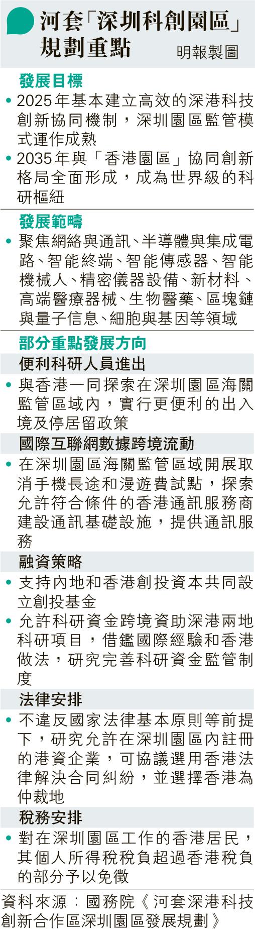 【明報專訊】國務院昨公布《河套深港科技創新合作區深圳園區發展規劃》(下稱《規劃》),就深圳園區發展提出共30項措施,包括為在深圳園區工作的香港居民提供稅務便利、研究在深圳園區註冊的港資企業可選用香港法律解決合同糾紛等。《規劃》提出,目標2035年聯同香港園區成為世界級的科研樞紐。特首李家超與創新科技及工業局長孫東歡迎中央公布《規劃》,李家超稱會繼續積極與深圳協調,發揮港深「強強聯手」的優勢。