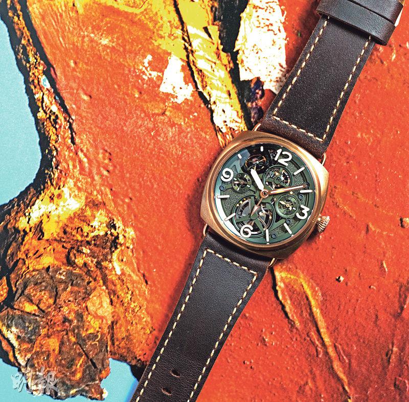 Radiomir Tourbillon Bronzo腕表是品牌首次在45毫米青銅表殼中裝置陀飛輪機芯,青銅材質會隨着不同的佩戴與使用習慣,透過天然氧化過程留下獨一無二的舊化質感,散發復古魅力,配搭柔軟的棕色復古小牛皮表帶和歷久彌新的錐形表冠,突顯Radiomir系列的特點。但當然腕表的焦點是精心設計的專利陀飛輪,創新的框架裝置會圍繞垂直於平衡擺輪的軸線旋轉,每30秒旋轉一圈,而非傳統的每分鐘一圈設計。全新設計的鏤空表橋,也能讓大家更清楚欣賞陀飛輪結構,並用上創新ALD沉積氧化鋁工藝塑造軍綠色外貌,令整體感覺更復古。