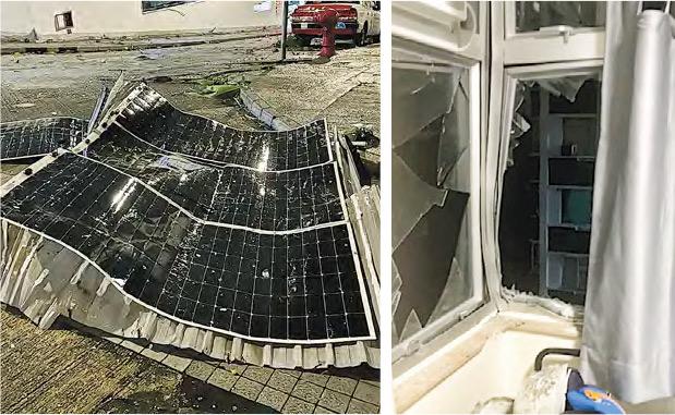 【明報專訊】超強颱風「蘇拉」襲港,多區有樹木、棚架及窗戶等不敵強風塌下或損毁。昨晚9時許,鰂魚涌南豐新邨天台太陽能板懷疑被強風吹起,撞向其中一個單位外牆,單位睡房最少兩扇玻璃窗碎裂,石屎及玻璃散落一地,未被完全吹落的太陽能板在天台搖搖欲墜。截至昨晚9時40分,10男4女在風暴期間受傷,到公立醫院急症室求診。