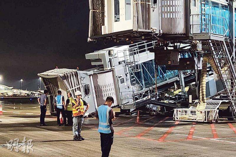 【明報專訊】赤鱲角機場中場客運廊一條暫停使用的登機橋昨晚疑油壓有問題傾斜塌下,無人受傷。網上圖片可見橋的出口貼着地下。有立法會議員敦促相關部門找出事故原因前應停用相同型號登機橋。