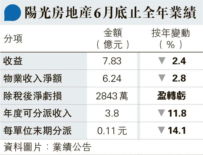 陽光房地產昨日宣布6月底止全年業績,期內物業收入淨額按年減少2.8%至6.24億元,並由盈轉虧,除稅後浄虧損2843萬元。年度可分派收入則按年減少11.8%至3.8億元;每單位分派則按年減少14.1%至0.11元。