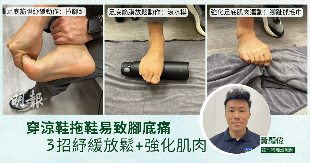 涼鞋、拖鞋、平底鞋方便易穿,惟長時間穿着容易引致腳底疲累,甚至出現痛症。註冊物理治療師黃顯偉解釋,穿涼鞋或拖鞋時,腳趾可能會反射性縮起,更用力抓緊鞋子,容易令足底筋膜過度疲累;平底鞋因鞋底太薄,亦會令足底筋膜較緊張和易疲累。黃顯偉在本文短片中示範三個簡單動作,幫助紓緩和放鬆足底筋膜,以及強化足底肌肉。(採訪:何芍盈、拍攝及剪接:莊靜芝)