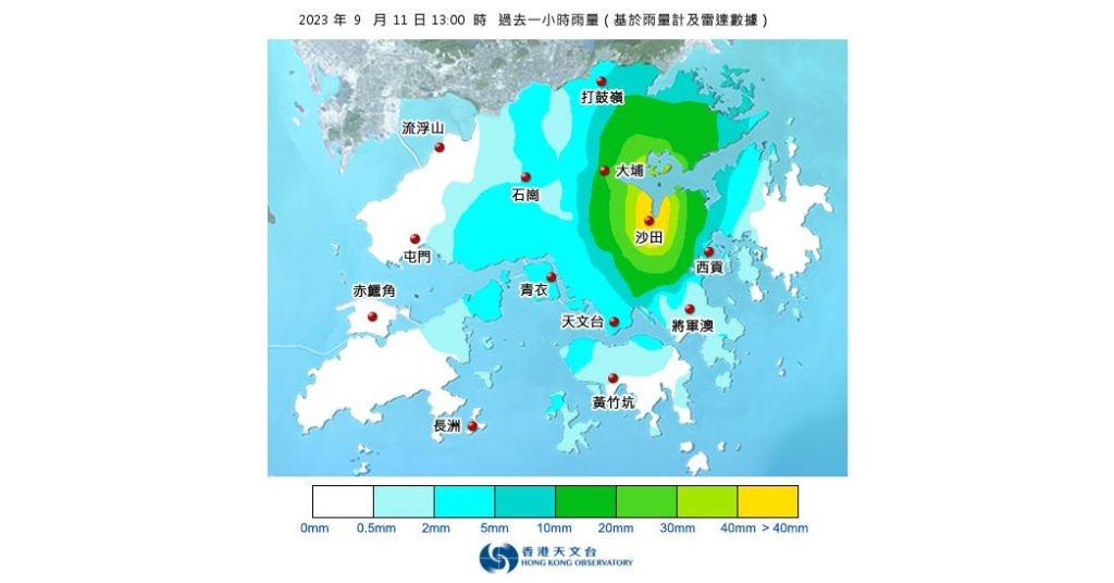 【13:00】天文台表示沙田區的雨勢特別大,有可能出現嚴重水浸。此外,該區在下午12時45分的過去一小時更已錄得超過80毫米雨量。