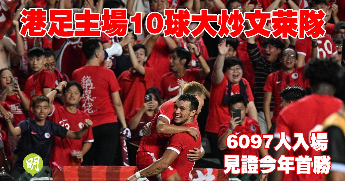 香港足球代表隊今晚(11日)在香港大球場友賽,憑入籍前鋒艾華頓,中場陳肇鈞及鋒將潘沛軒各梅開二度,於下半場狂轟7球,在6097人入場下以10:0大炒文萊隊,取得今年首場勝仗,兼結束連續6場不勝走勢。