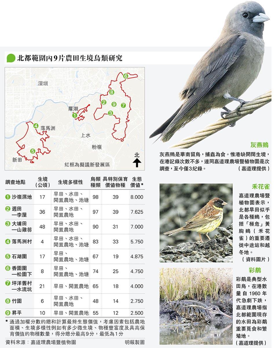 【明報專訊】政府2021年公布 《北部都會區發展策略》,嘉道理農場暨植物園同年開展為期一年的調查,並在北都範圍內選定9片共約167公頃的農田生境做鳥類研究。嘉道理昨公布結果,稱調查記錄154種雀鳥,當中66種具特別保育價值,包括全球「極危」的黃胸鵐(禾花雀)及只在本港有3次紀錄的灰燕鵙等。嘉道理稱,本港活躍耕地不足1%,當中不少位於北都,而農田是多種鳥類的遷徙中途站、越冬地及覓食地,若農地消失,鳥類必減,促政府制定全面的農田生物多樣性保護策略。