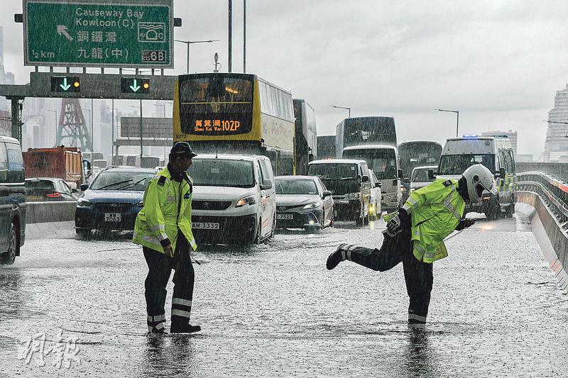 【明報專訊】天文台昨天清晨5時55分發出紅色暴雨警告信號,生效逾4小時,本港多區出現水浸。石澳道近爛泥灣早前坍塌位置昨日擴大,早上需全線封閉,昨晚9時方重開讓輕型車輛經過。柴灣一帶亦有水浸,上周黑雨「重災區」環翠邨停車場再遭水淹,部分位置水位浸至車轆。另因路面水浸,東區走廊往柴灣方向近和富中心、東區走廊往中環方向近北角消防局的部分行車線亦一度封閉。