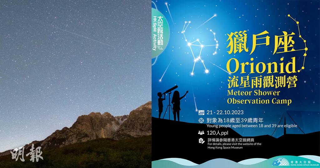 獵戶座流星雨預計在10月22日迎來高峰期,太空館將於10月21至22日舉辦觀測營讓青少年參加。太空館表示,由於當晚觀測流星雨不受月光影響,令獵戶座流星雨成為今年觀測條件最佳的流星雨現象之一。有意參加的18至39歲人士,可於本月25日前到香港教育城網站報名,參加者名單將於本月27日抽籤決定。
