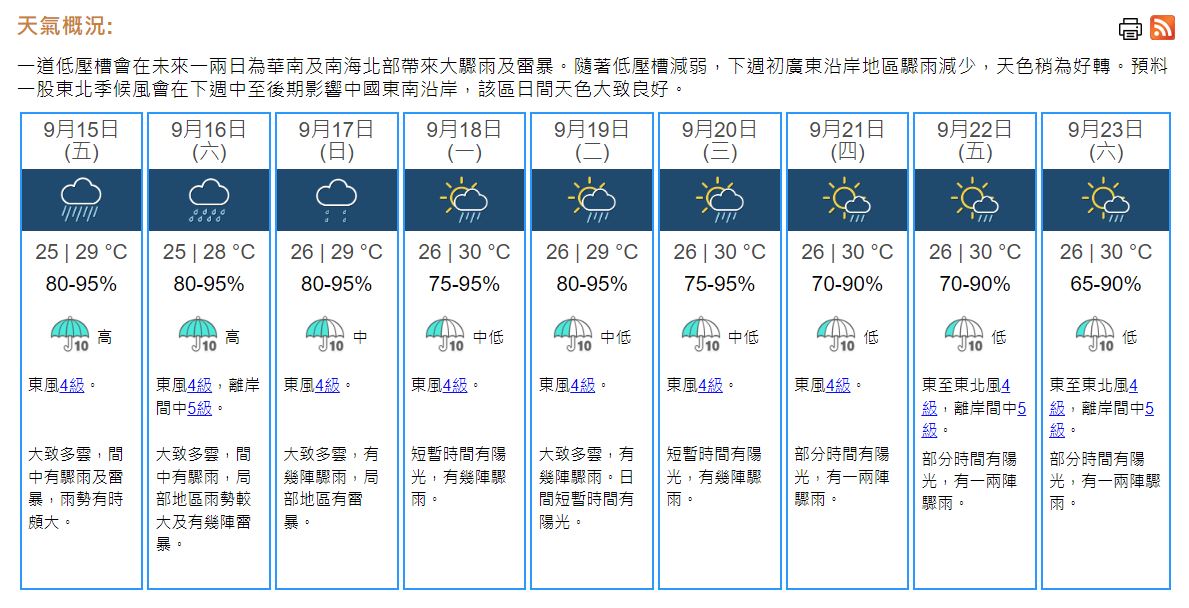 即時熱點 天文台:多雲間中有驟雨及雷暴 最高29°C (08:40) 發佈於 2 年 前 2023 年 9 月 15 日 By 明報 上午8時30分,天文台錄得27.7°C,相對濕度87%。一道低壓槽正為廣東及南海北部帶來驟雨及雷暴。本港地區今日(15日)大致多雲,間中有驟雨及雷暴,雨勢有時頗大。最高氣溫約29°C。吹和緩偏東風。展望明日(16日)有驟雨及雷暴。隨後兩三日仍有幾陣驟雨,短暫時間有陽光。(天文台) 相關文章:天文台天氣天氣速遞編輯推介 Up Next 光影裝置「月亮製造機」尖沙嘴文化中心外展出【多圖】 (18:43) 不要錯過 夜經濟|商場夜市消費優惠一文睇 (08:57) 繼續閱讀 贊助商 猜你喜歡 天氣|天文台:周日早上市區最低14℃ 部分地區寒冷 (17:55) 天氣|天文台:多雲有幾陣雨 今晚轉涼降至約17℃ (09:25) 【Emily】天文台「矚目天氣及氣候事件選舉」 投票有機會獲紀念品 天氣|天文台:周六多雲有雨 晚上轉涼氣溫17至21°C 下周日跌至最低14°C (21:22) 天氣|天文台:短暫時間有陽光 最高19°C (08:24) 天氣|天文台:周四多雲早晚有微雨 氣溫介乎17至20°C (20:57)