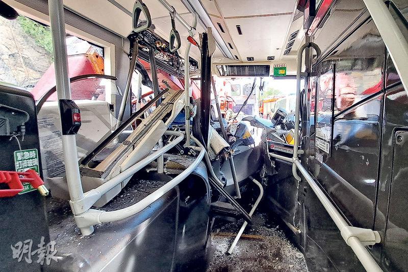 【明報專訊】屯門公路昨日發生嚴重車禍。一輛往荃灣方向行駛九巴,突然猛撼疑因故障停在路肩的重型貨車,巴士車頭左方陷入貨車尾,損毀嚴重。事件釀成43人受傷,當中一名巴士女乘客情况危殆。警方將循司機精神狀態等方向調查意外起因。