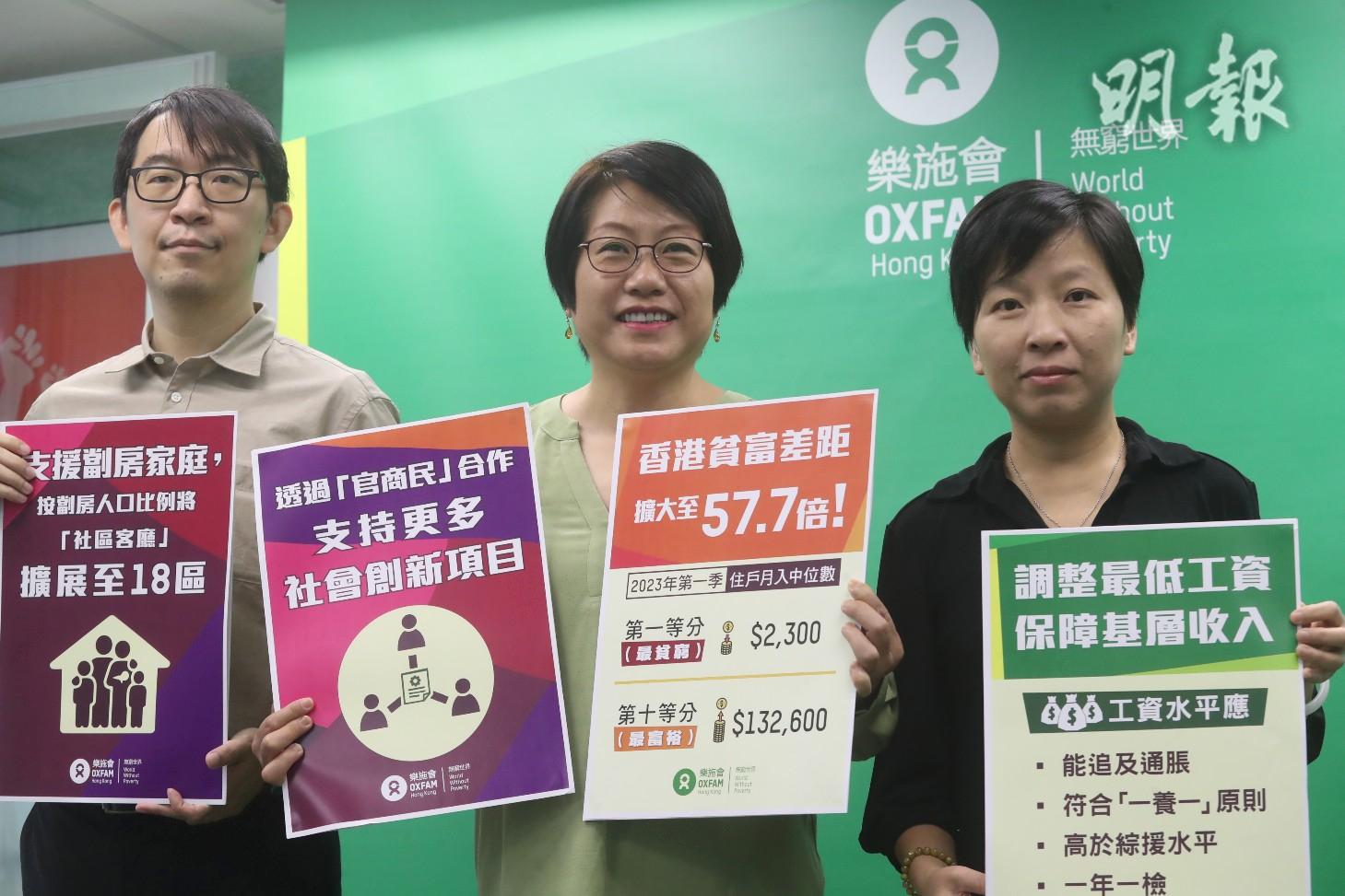 樂施會總裁曾迦慧指出,雖然社會全面復常,但貧富懸殊問題愈發嚴重,貧窮家庭更加「水深火熱」,對整體社會已經響起警號。她呼籲政府在考慮進一步輸人外勞前,應先透過調高最低工資、創造就業和提供其他誘因,以協助基層就業。同時,政府應加強對劏房家庭的支援,按劏房人口比例將「社區客廳」擴展至18區。另透過「官商民」合作的方式,投放資源培育和支持更多具有社會影響力的創新扶貧項目,以擴大慈善事業的規模和影響。