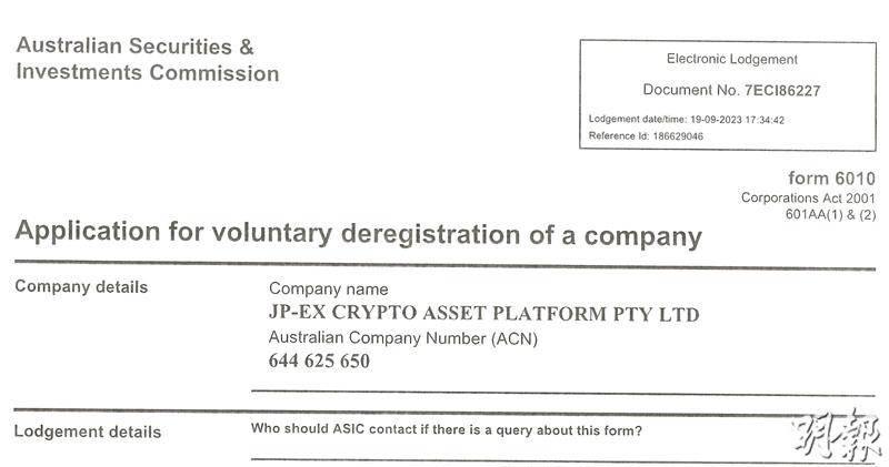 【明報專訊】「綠石數字資產平台」(JPEX)涉嫌串謀詐騙案續有新進展。本報偵查發現,JPEX在澳洲取得牌照的登記公司「JP-EX CRYPTO ASSET PLATFORM PTY LTD」前日(19日)已向當地監管機構「澳洲證券與投資委員會(ASIC)」申請自願撤銷註冊(voluntary deregistration),根據該公司在申請文件聲明,公司資產價值少於1000澳元(約5080港元)。立法會會計界議員黃俊碩憂慮此舉或有意挾款私逃,建議受影響投資者盡快尋求專業人士到澳洲申索,以保存該公司資產。