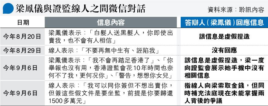 證監會代表昨日指出,梁今年8月至9月間多次與一名招姓女士透過微信對話(見表),其中梁傳信息表示「我不會再踏入香港」、「證監會花10年時間也奈我不何,更何况你」、「警告,想想你女兒」等。證監會接獲線報後,發現梁正出售其位於上海的物業。證監會估算梁分別在香港、上海及加拿大持有的物業,總價值約1.9億元。
