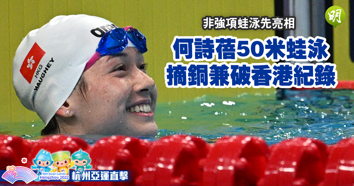 港隊游泳星將何詩蓓(Siobhan)今(14日)於非強項的女子50米蛙泳亮相,先於初賽以破香港紀錄的30.46秒出線,並於決賽再次刷新港績,以30.36秒摘銅。