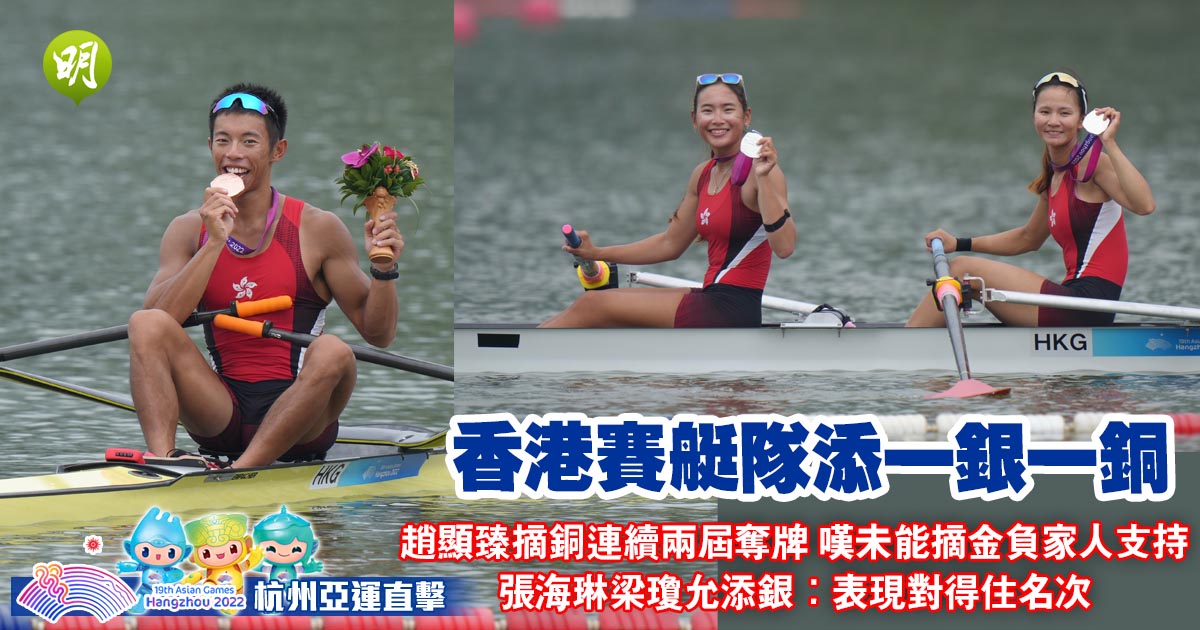港隊在杭州亞運賽艇項目再傳捷報,港將趙顯臻今早(25日)出戰男子單人雙槳艇決賽,後上以7分00.55秒成績奪得銅牌,連續兩屆奪得獎牌,加上張海琳/梁瓊允於女子雙人單槳無舵艇取得銀牌,香港賽艇隊總結今屆亞運以1金1銀1銅收官。