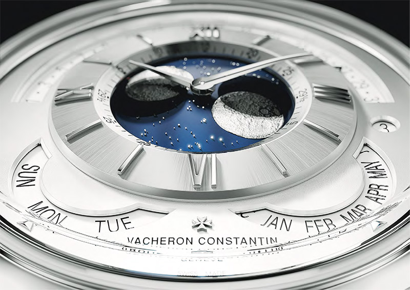 坊間純粹搭載月相功能的腕表不算多,大部分月相功能也是融合在年曆或萬年曆之中,例如Breguet剛推出的Classique系列萬年曆腕表。萬年曆是早在18世紀的經典鐘表功能,能夠按照月份長度和閏年周期準確顯示日期。為了實現這項高超技藝,機芯需要擁有長達4年(相當於1461天)的機械「記憶」。腕表配搭502.3.P型機芯,厚度僅為4.5毫米,是品牌最纖薄的機芯之一。月相顯示設於1時和2時之間,手工捶打的表面呈現迷人質感。星空部分覆以藍色亮漆,上方散佈代表星星的細小閃光金屬片。