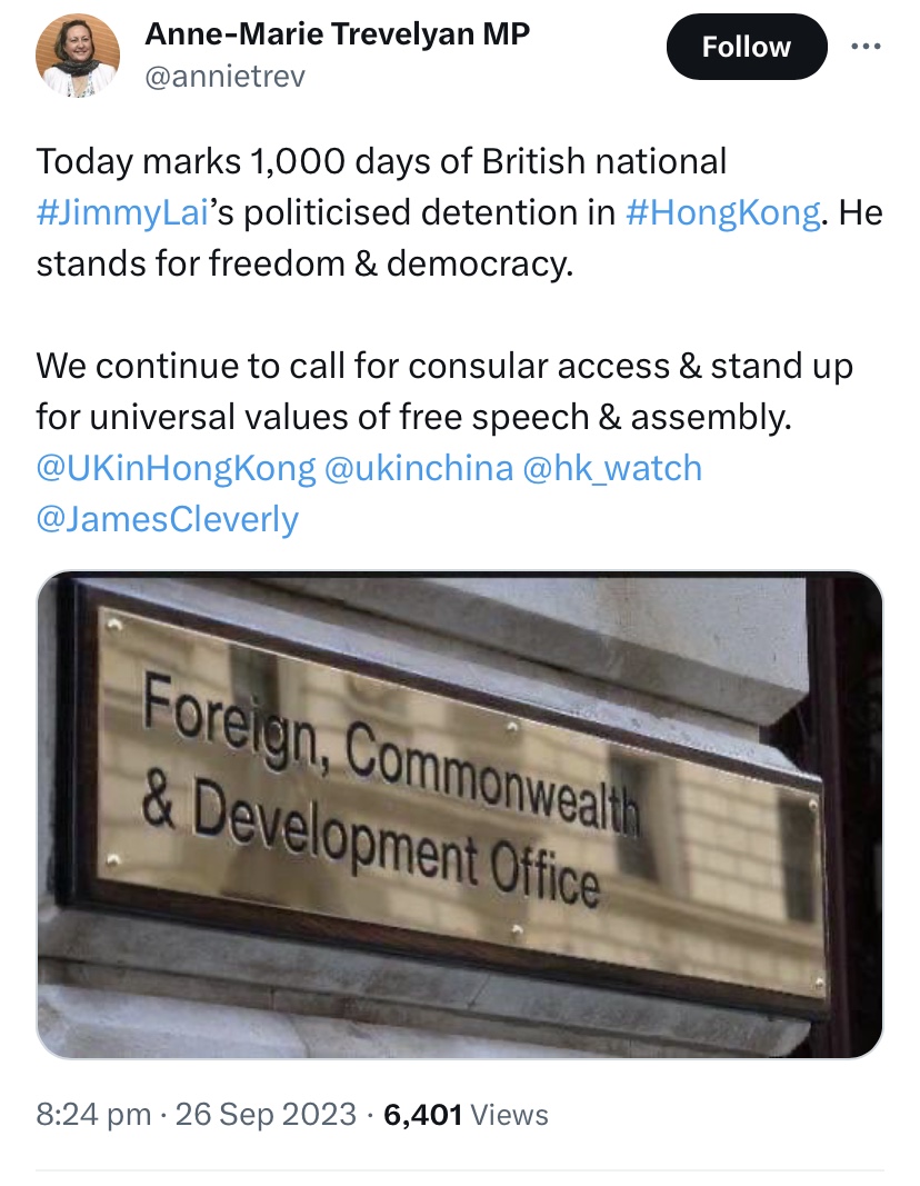 英國外交部印太事務國務大臣卓雅敏周二在社交網站「X」以「英國公民」稱呼黎,稱英方將繼續呼籲容許黎獲領事探視。
