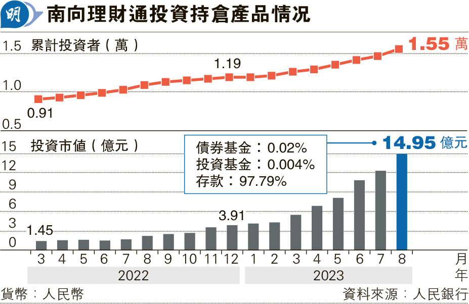 據人行數據顯示,截至今年8月底,參與南向理財通的內地投資者,持有港澳投資產品市值餘額14.95億元(人民幣,下同),按年大增5.66倍或12.71億元。不過增長主要由於本港高息下,期內存款上升12.56億元,存款佔南向投資市值近98%,投資基金餘額僅增960萬元至2700萬元。