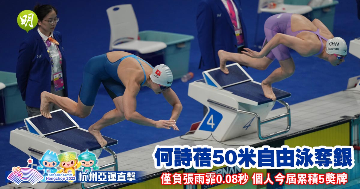 港隊「女飛魚」何詩蓓今晚(28日)在杭州奧體中心游泳館出戰亞運女子50米自由泳決賽,結果游出24.34秒,以0.08秒之微屈居於打破亞運紀錄的中國隊泳手張雨霏,獲得銀牌,個人本屆累積2金1銀2銅。